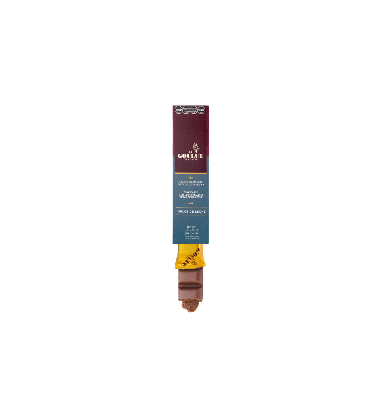 Chocolate con leche 35% cacao relleno con dulce de leche cremoso.