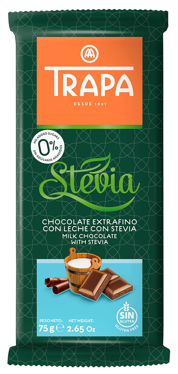 Tableta de chocolate extrafino con leche con stevia, sin gluten y 0% azúcares añadidos.
