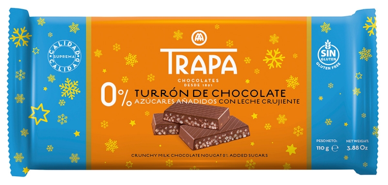 Turrón de chocolate con leche crujiente con edulcorantes sin azúcares añadidos. Turrón diverso.