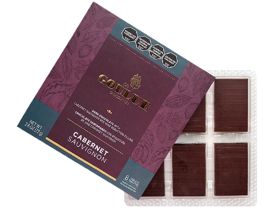 Chocolate semiamargo intenso con un corazón de Cabernet Sauvignon. Profundo, aromático y con un final persistente y elegante.